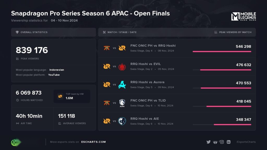 Esports Charts revealed that the SPS Season 6 APAC Open Finals for MLBB reached an impressive peak of over 830,000 viewers.